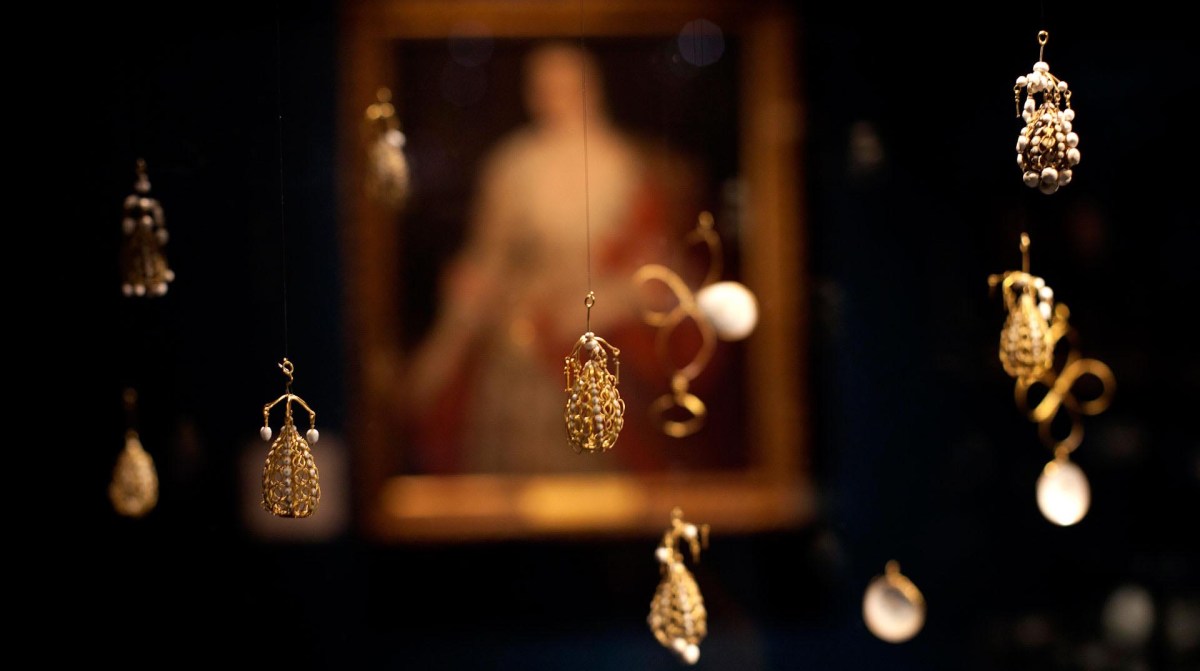 The Cheapside Hoard Previous Next Published August 3, 2016 at 1920 × 1075 in The Cheapside Hoard (2013) Pearl and wirework cage pendants beautifully displayed and lit in the exhibition space