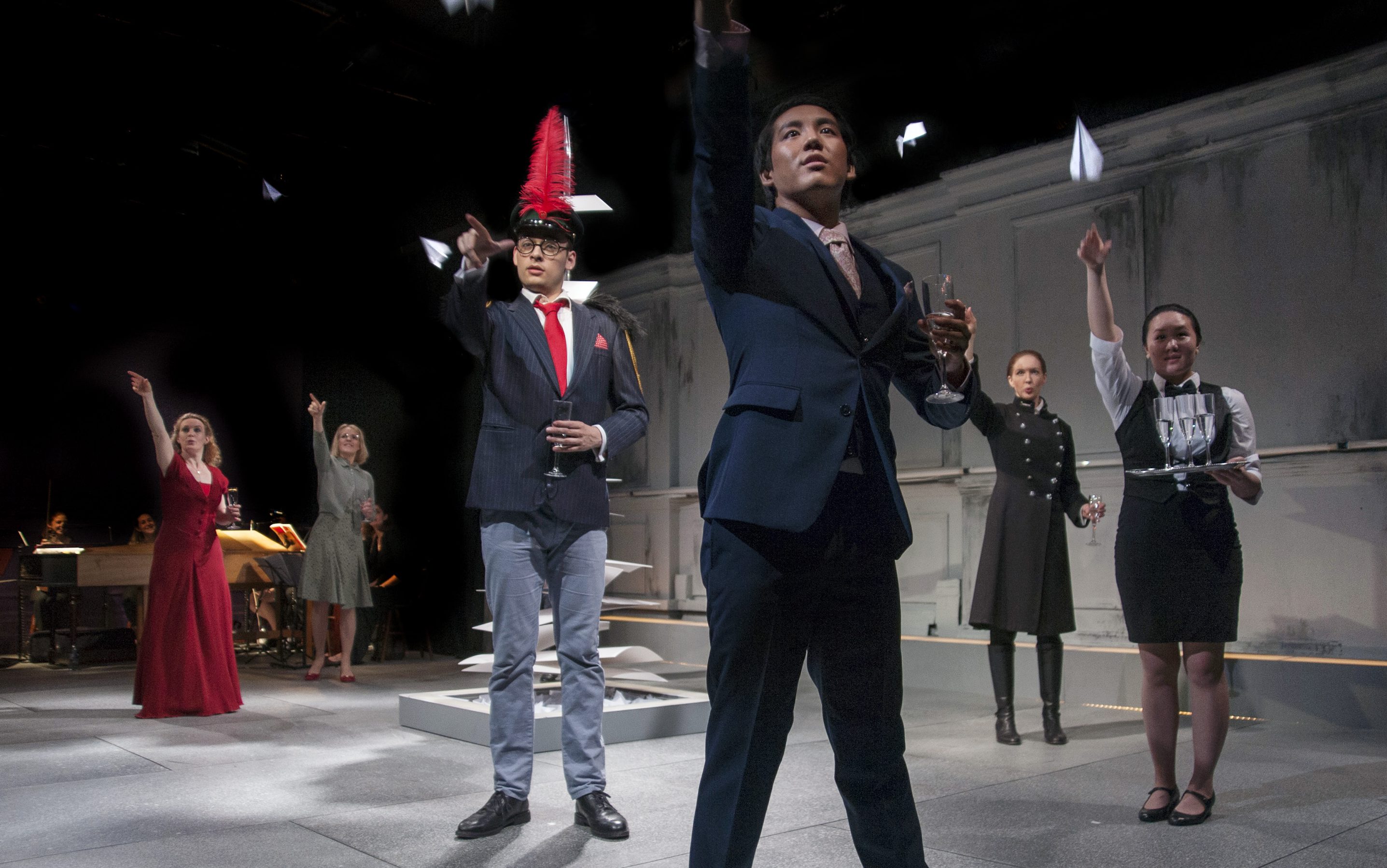 Xerxes (Paul Bork) launches paper planes to celebrate his victories, accompanied by Atalanta (Sophie Pullen), ‘Ariodate’, i.e. the disguised Elviro (James Schouten), the disguised Amastris (Madeleine Sexton) and a waitress (Beverley Vong) © Laurent Compagnon