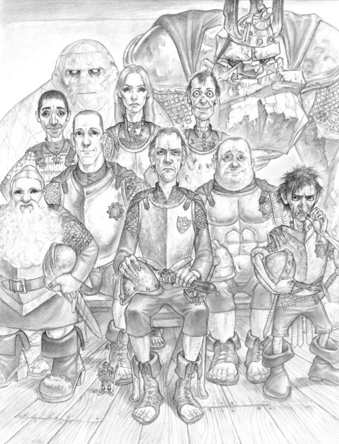 Paul Kidby, The Unusual Suspects. This dates from a later book than Men at Arms, with a few Watchmen who don’t feature here, but you can see (seated centre) Vimes flanked by Carrot (left), Colon and Nobby (right), with Angua standing behind Carrot’s shoulder and Detritus at back right © Paul Kidby
