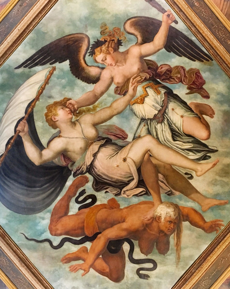Vasari: Virtue overcoming Fortune and Invidia Previous Next Published July 5, 2017 at 2444 × 3074 in Fraternities and Frescoes: A Week in Arezzo Giorgio Vasari, Virtue overcoming Fortune and Invidia (Envy), oil on canvas. Mounted in the centre of the ceiling of the grand entrance hall, Casa Vasari, Arezzo