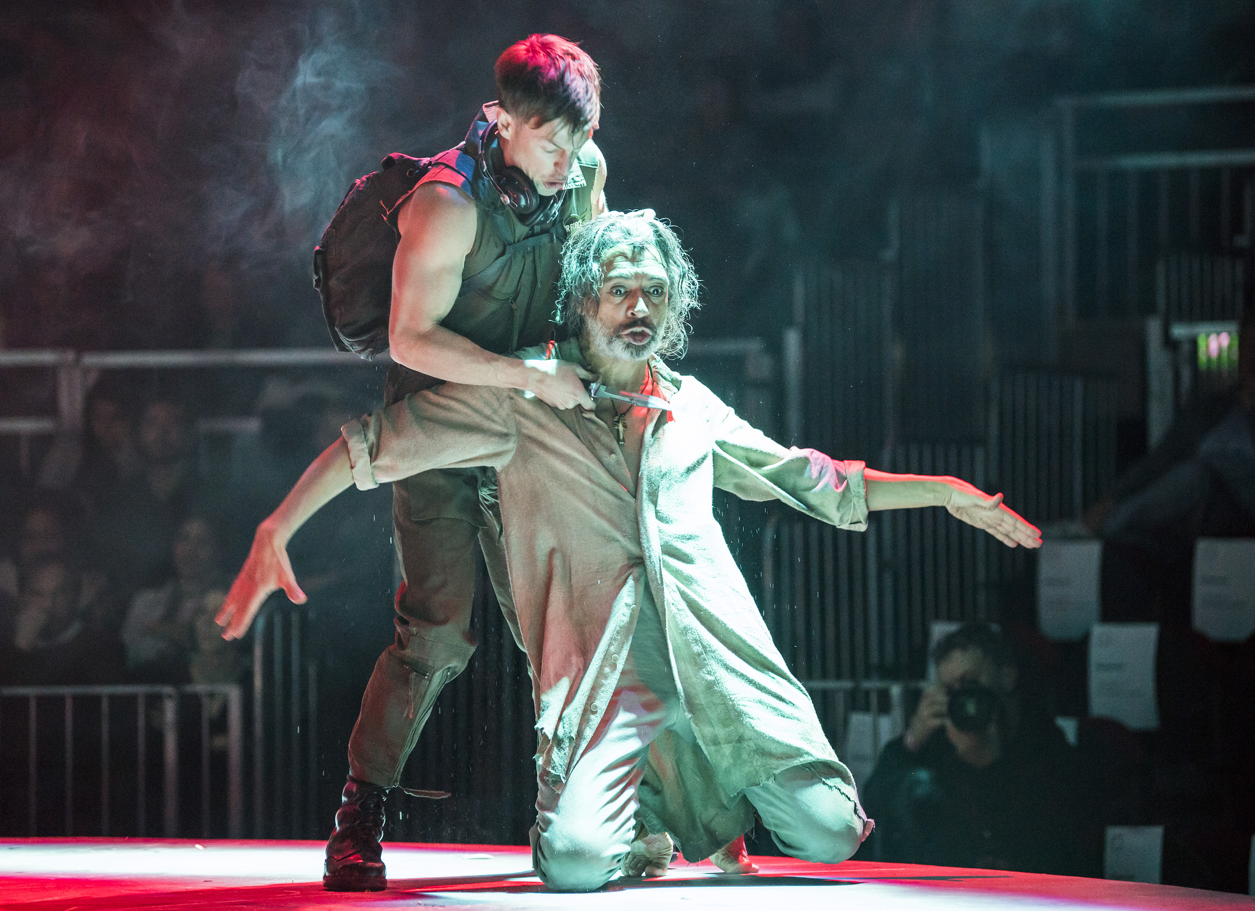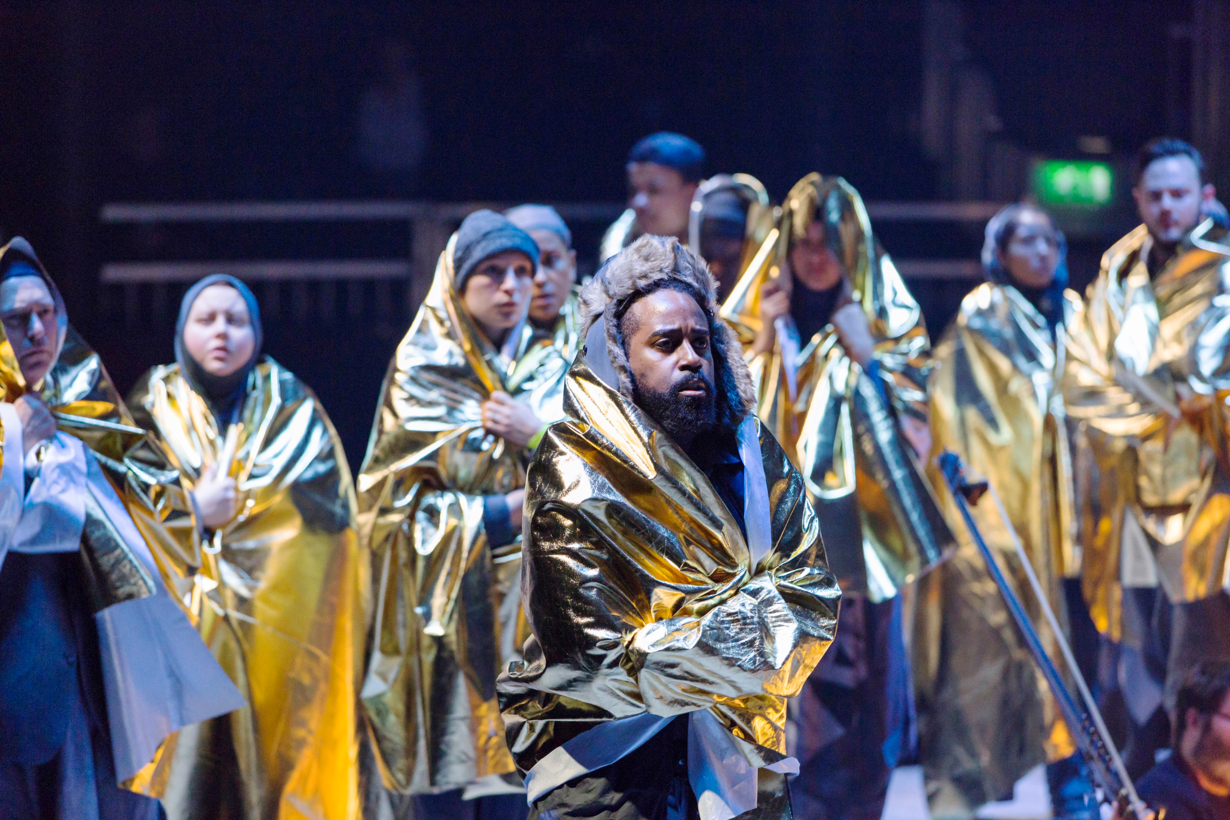 Peisander (Tai Oney) and the displaced people of the Chorus © Stephen Cummiskey