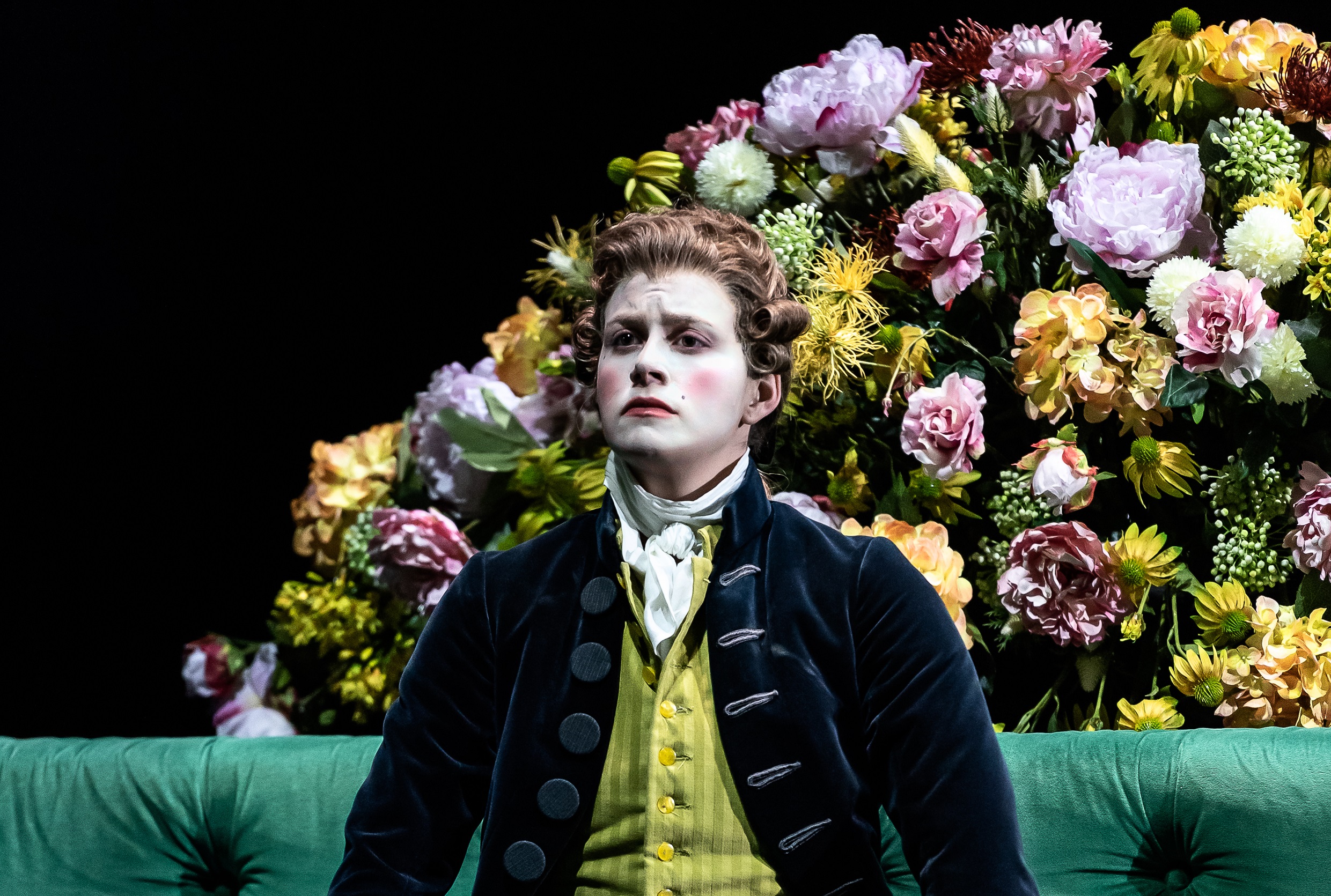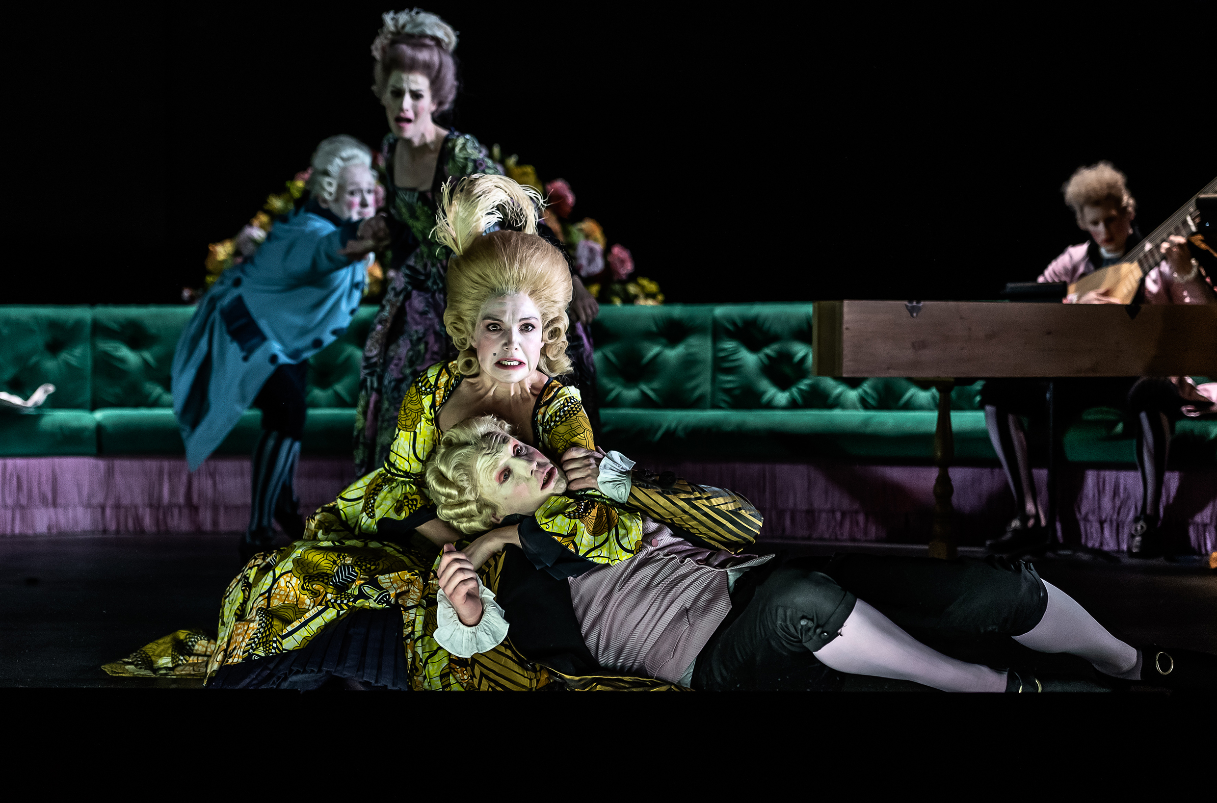 Just as I came to terms with how wonderful this was, three members of the orchestra tripped on stage, similarly dressed: an archlutenist (Jonas Nordberg), cellist (Mark Caudle) and harpsichordist (Oliver John Ruthven) in rolled wigs, Nordberg’s daringly frizzed on the top. All were wearing striped stockings and I was glad to see that they’d also been provided with teacups. The entire cast looked terrifically supercilious, staring out into the auditorium as if the plebs had stormed the palace (Patrick Terry looked especially lordly). The curved sofa was flanked by ‘basalt’ sphinxes supporting light-globes on the top: a simple set, but one that proved to be very effective.