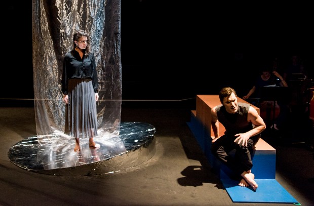 Climene (Helen May) commiserates with Egisto (Kieran White) Photo: Laurent Compagnon