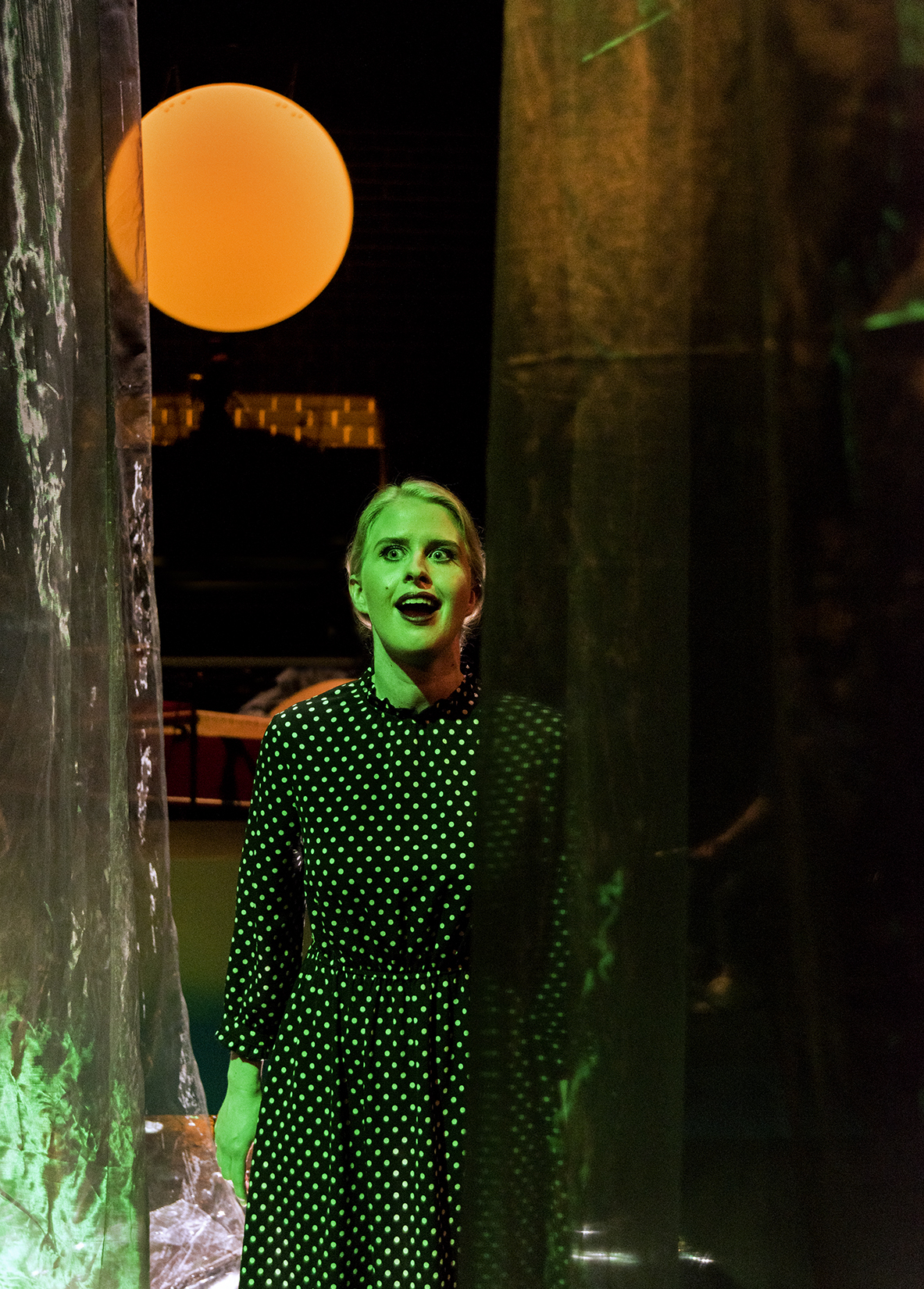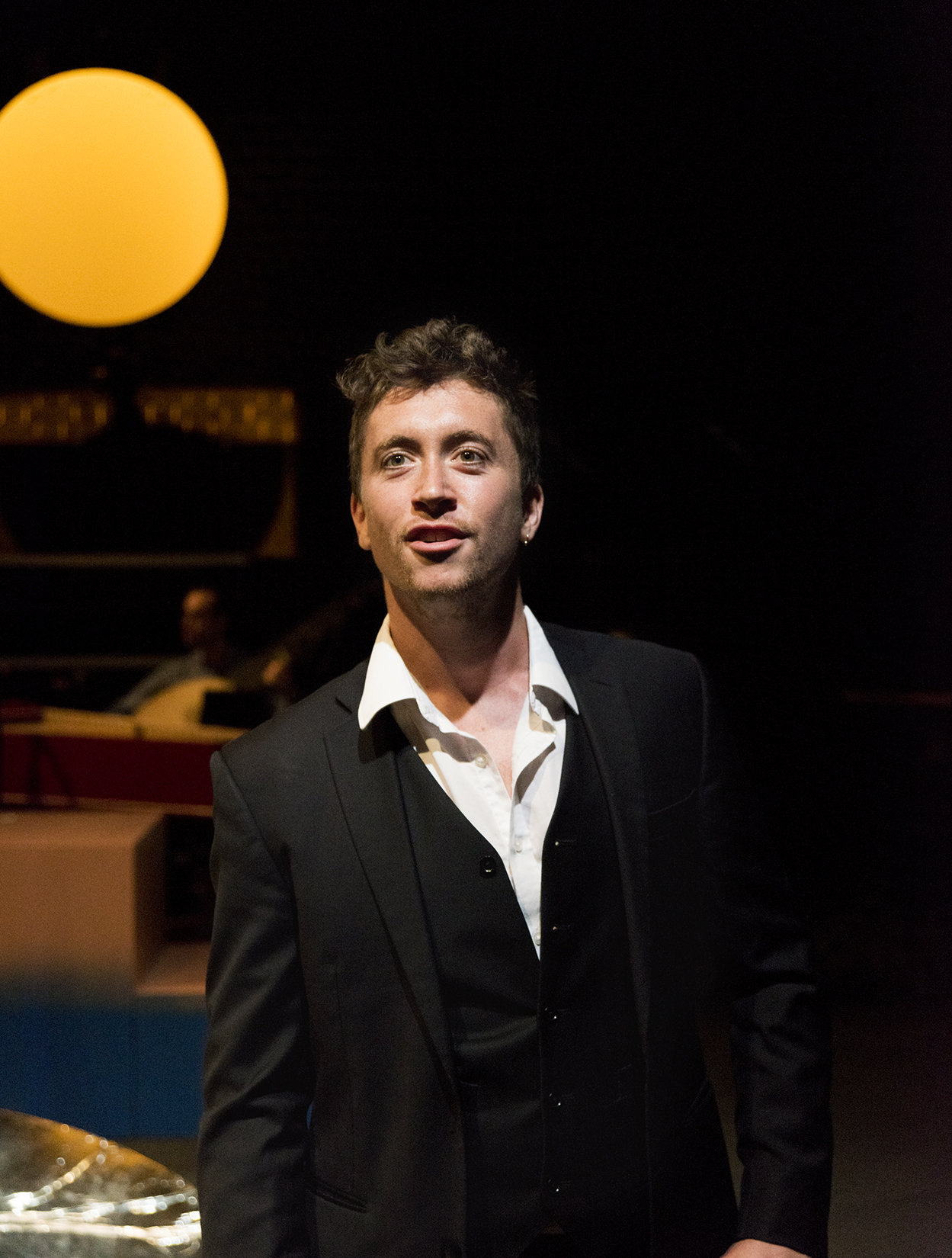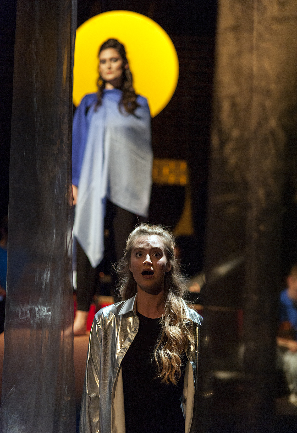 My confusion probably wasn’t helped by a logistical issue with the surtitles, which were projected on the left-hand side of the back wall. Unfortunately, for those of us sitting on the right-hand side of the theatre, they were largely obscured by a hanging sun-disc, which charted the passage of time throughout the opera (in itself, an excellent idea). As I could only see half of each line, this posed some problems with comprehension.