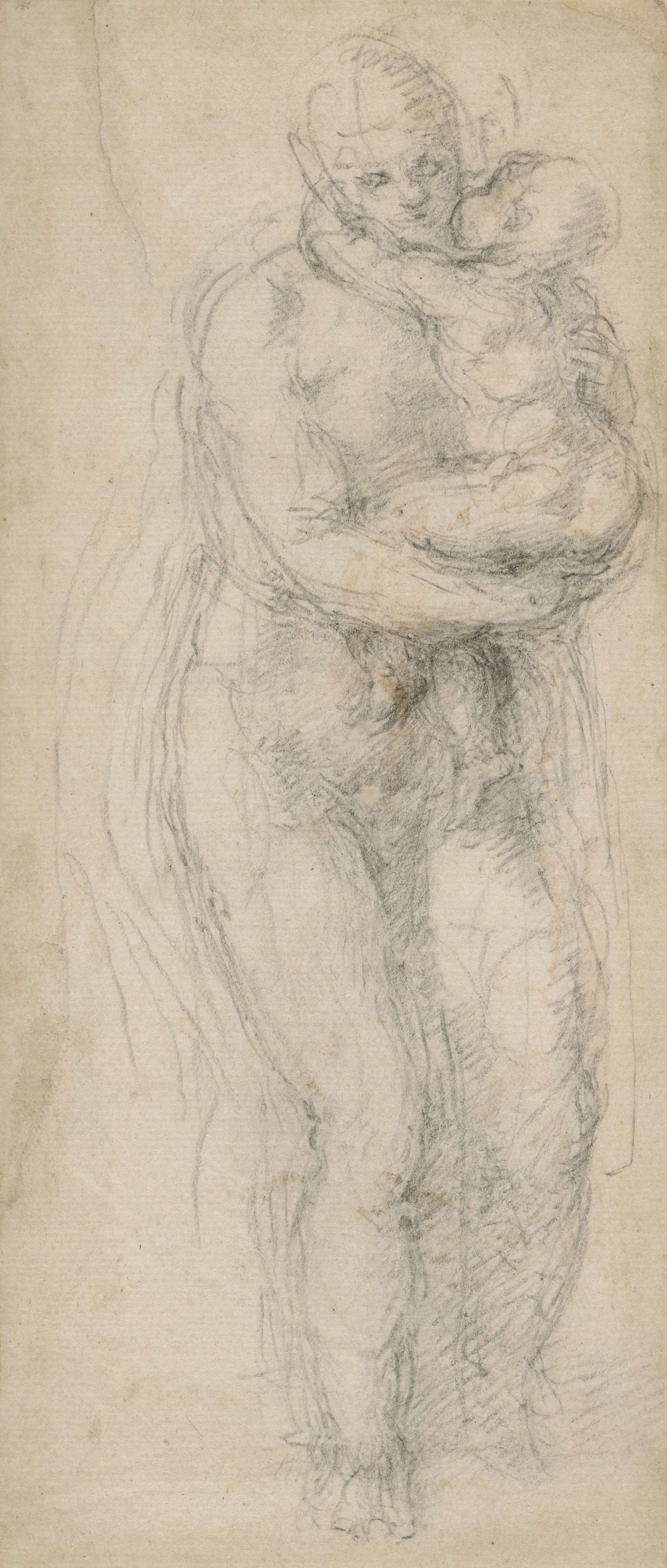 I think that anyone who spends an extended time with Michelangelo conceives their own idea of him. His letters and biographies certainly give us enough material for a myriad of interpretations, and perhaps the Michelangelo we end up with says more about us than it does about him. The Michelangelo I’ve ended up with is, perhaps, a rough diamond, his abrasive surface hiding a vulnerability that rarely comes to light – but, when it does, it’s startling. We can look at these drawings – which have somehow, miraculously, survived half a millennium – and we see things which resonate with something deeply human within ourselves. In his last thirty years, Michelangelo is constantly weighing up the physical and the intangible; the mortal and the divine; the earth-bound and the sacred. His familiar muscle-bound bodies become more compact, more solidly anchored to the earth, like the weighty saints of Giotto and Masaccio he’d seen as a young man. And yet, even here, there are exceptions: the occasional Christ, or the young Virgin holding her baby in her arms, where the figure becomes attenuated, gracefully indistinct, the contours dancing tantalisingly out of reach.